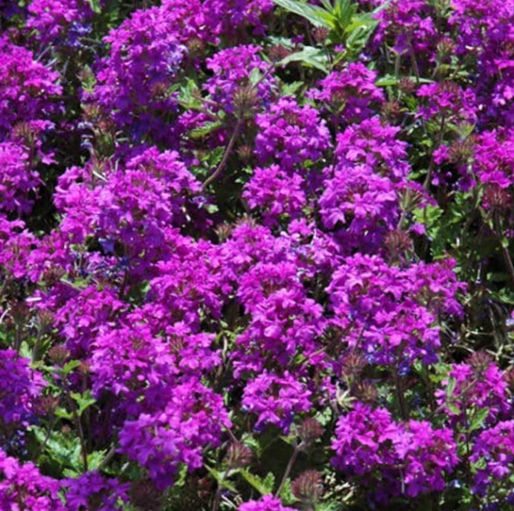 Homestead Purple Verbena (Verbena canadensis ‘Homestead Purple’) is a vigorous, trailing perennial prized for its intense, deep-purple flower clusters and exceptionally long bloom season from late spring until the first frost. This fast-spreading variety forms a dense mat of color, making it an excellent low-maintenance ground cover for sunny landscapes. Highly heat-tolerant and adaptable, it thrives in hot climates and continues blooming even through summer’s peak. Once established, it is notably drought-tolerant and requires minimal care. The nectar-rich blooms attract butterflies and bees, while its lightly textured foliage is generally deer-resistant. Ideal for mass plantings, borders, and rock gardens, it also performs beautifully as a “spiller” in hanging baskets and mixed patio containers, where its trailing stems drape over edges gracefully